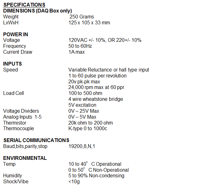 This basic internal Data Acquisition System (DAQ) is a 10 bit low speed system is for reading 0 to 5V analog signals from various sensors commonly used in engine testing such as Thermocouples, Pressure Sensors,Voltages and etc. Several channels are available for this use, and can be displayed and logged to a computer. Some conversion may be required to convert the voltage back into a useful measurement An offset, scaling factor and filtering factor are provided in the Calibration screen of the DAQ Monitor software.